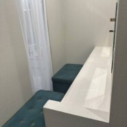 受付カウンターと化粧スペースのテーブルの高さも実際に置くイスをそこに置いて座って高さを決めてもらいました。